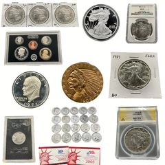 warningFeast your eyes on this outstanding group of coins, ideal for collectors, investors, dealers, etc. to include excellent collection of Morgan and Peace dollars, many having been certified; nice allotment of silver eagles plus large amount of silver material such as very large group of Kennedy halves both 90& and 40% silver. There are many key date Morgan and Peace Dollars that have been certified. Also in this auction are proof sets (some silver), plus a variety of other mint products. Over 400 lots await your viewing and bidding, with something for just about any collector's needs and desires. Happy bidding!!